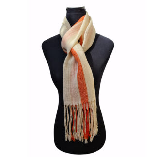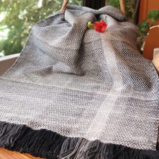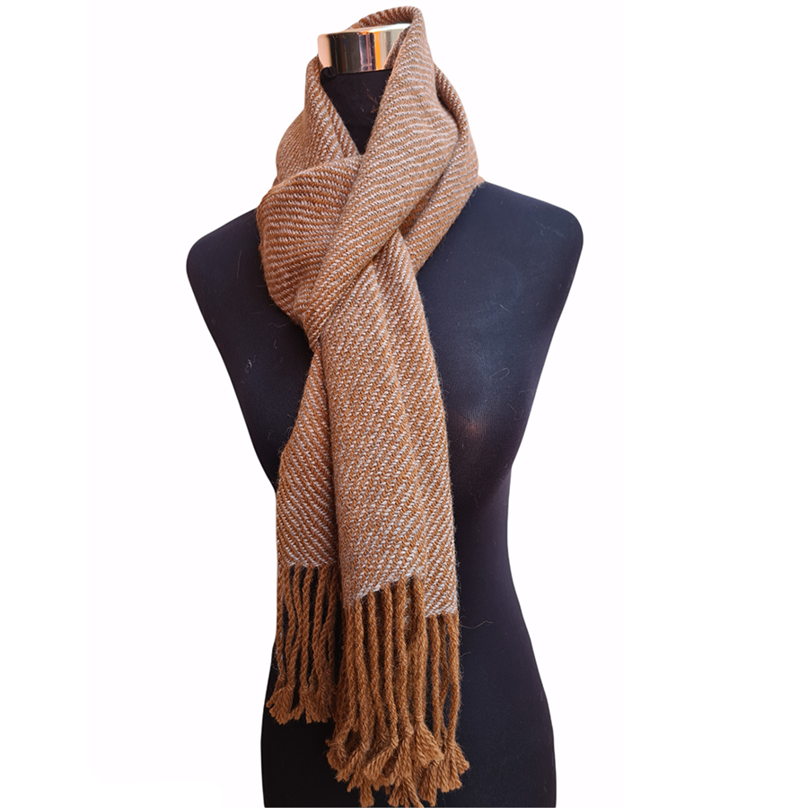 Tejido realizado en telar de cuatro pedales, diseño palma, 100% lana de alpaca, pieza hecha a mano por artesanas aimaras, bufanda combinada en colores naturales, son livianas y tan cómodas que no se sienten, suaves como brisa cálida del norte.